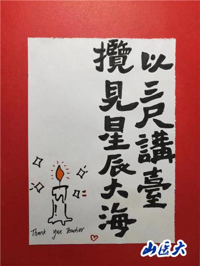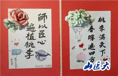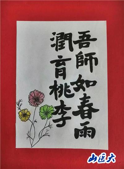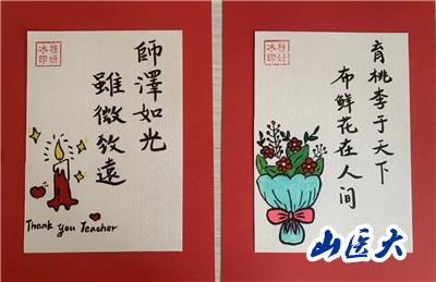 此次活动内容主要围绕“一朝沐杏雨,一生念师恩”主题来展开,支部党员们通过绘画、书法、制作手工贺卡等形式,制作了“桃李满天下,春晖遍四方”“老师您辛苦了”“师以匠心,遍植桃李”“尚感恩情怀,崇尊师美德”等卡片。同学们在动手实践的过程中体悟老师们的辛苦付出,用真挚且具有创意美感的作品表达他们对老师们精心培养的感激之情。