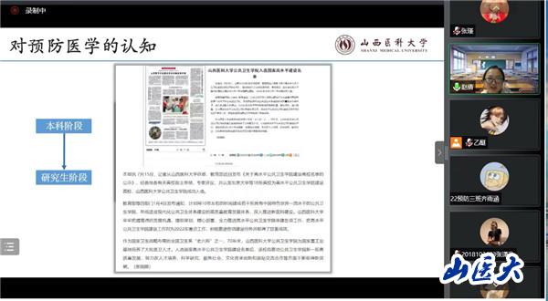 随后,现就职于天津市南开区疾病预防控制中心的王琦、就职于大连长兴岛海关的吴欣桐二位学姐分享了她们在校时的学习、工作、实践经验,鼓励同学们在大学期间要尽早树立目标,明确方向,丰富自己的综合技能。她们结合自身工作经历,使同学们深刻体会到在疫情大环境下公共卫生所发挥的重要作用,同学们对于自己身为公卫人的自豪感油然而生,增强了专业自信。