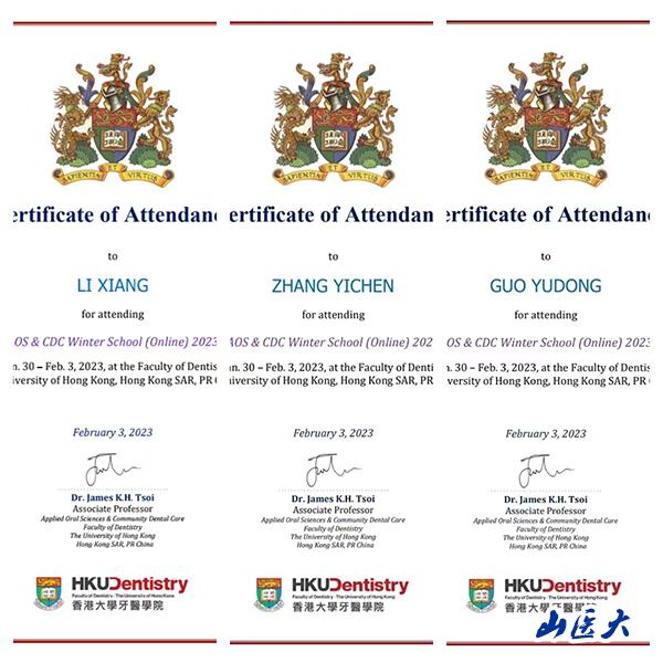 2023年寒假,我校口腔医学院郭玉栋、张一辰和李想同学与多所院校的41名学生共同完成了“香港大学牙医学院在线课程”研究学习项目。
