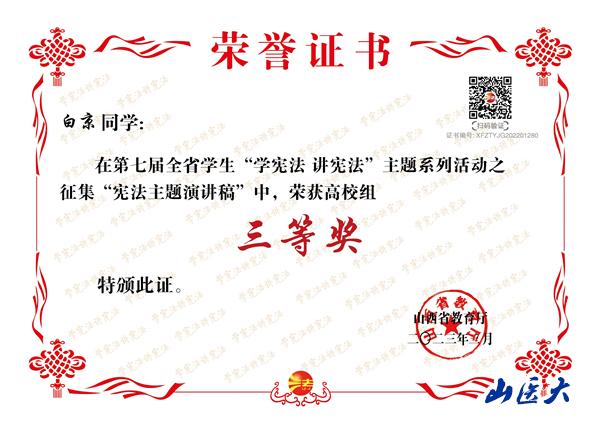 “学宪法讲宪法”主题系列活动是山西省教育厅每年组织的一项重要普法活动,也是我校面向广大师生进行法律宣传的主要活动内容。近日,山西省教育厅公布了在2022年全省教育系统的“学宪法、讲宪法”活动中表现突出的先进集体和个人,我校荣获优秀组织奖,基础医学院学生白京与指导老师李佳洁分获三等奖与优秀指导教师奖;护理学院学生张玲辉获宪法知识竞赛决赛优秀奖;另外,在“我与宪法”微视频活动中,第一临床医学院学生贾志杰、廖晴雪,儿科医学系学生杜娟、任若瑜分获优秀奖。