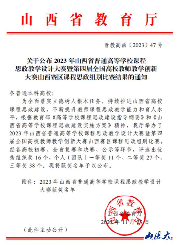 山西省普通高等学校课程思政教学设计大赛是由山西省教育厅主办,山西省高校课程思政建设联盟承办。大赛旨在深入落实立德树人根本任务,大力推进高校课程思政建设,持续深化高校教育教学改革,发挥课堂育人主阵地作用。经各高校初赛、省级复赛、决赛和冠亚军争夺赛等程序,共评选出一等奖11个、二等奖27个、三等奖38个。