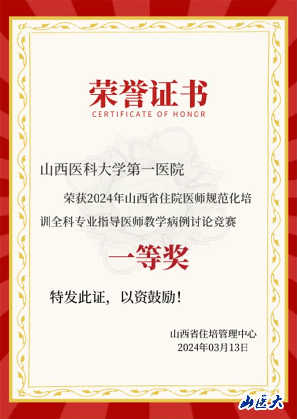 3月13日,第一医院荣获山西省卫生健康委员会科教处主办的2024年山西省住院医师规范化培训全科专业指导医师教学病例讨论竞赛一等奖,并获得代表山西省参加即将举行的第三届全国全科专业指导医师教学综合能力技能竞赛资格。