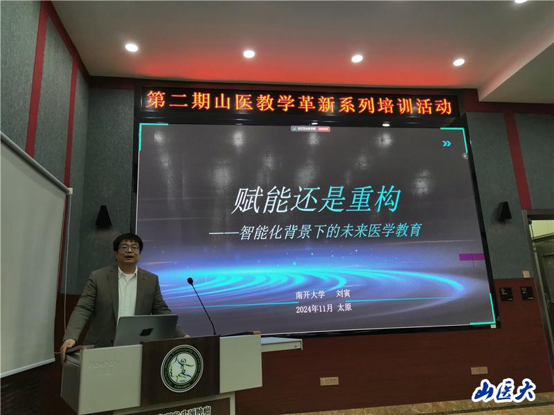 11月18日,山医教学革新系列培训活动第二期在第一临床医学院举行,特邀南开大学医学院的刘寅教授做专题培训。第一临床医学院副院长韩清华、学校教务部副部长刘佳佳、教务部医学教育研究中心主任刘楠等出席开幕式。第一临床医学院60余名临床教师参加了线下培训,线上1200余人同步观摩。培训由第一临床医学院教学部部长施熠炜主持。