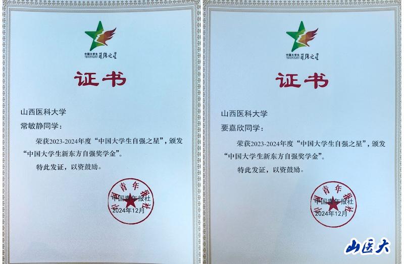 2023-2024年度“中国大学生自强之星”活动以“自信自强 挺膺担当”为主题,号召广大青年在科技创新、乡村振兴、绿色发展、社会服务、卫国戍边等各领域各方面挺膺担当,展现新时代中国青年有理想、敢担当、能吃苦、肯奋斗的风采,共产生1610名“中国大学生自强之星”个人、100个“中国大学生自强之星”科创团体和32个优秀组织单位。我校两名学子获得此项荣誉,展现了山医青年的风貌和担当,全校广大学生以“中国大学生自强之星”为榜样,坚定不移听党话、跟党走,用实际行动在推进民族复兴伟业中展现青春风采,让青春在中国式现代化建设的火热实践中不断绽放绚丽之花。