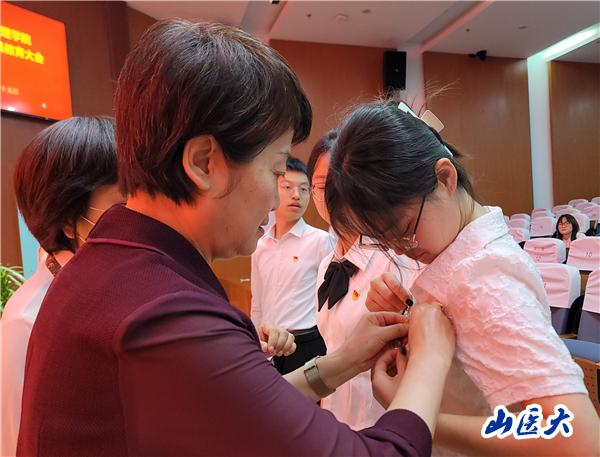会议在庄严的国歌中拉开序幕。与会老师为全体毕业生党员佩戴党员党徽。全体师生党员在本科生第一党支部书记郝志媛的带领下,重温入党誓词。毕业生党员代表毕研新、魏美琪分别作了情感真挚的发言,感恩党组织、母校以及学院老师悉心栽培和谆谆教诲,表示在新的人生旅程中,将始终秉持“医理博精 德能高邃”的校训精神,时刻以一名合格党员的标准严格要求自己,将小我融入大我,坚定信仰,努力学习,扎实工作,让青春在为祖国、为人民、为民族的奉献中焕发绚丽光彩。