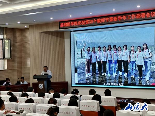 基础医学院党委书记王卓代表学院党政向全体教职员工致以节日的问候。他指出,学院全体教师在校党委的坚强领导下,扎实开展学习贯彻习近平新时代中国特色社会主义思想主题教育,全面贯彻落实党的教育方针,以强烈的事业心和责任感,奋战在教书育人的第一线,凝心聚力推进学院的高质量发展。他结合学院实际,向全体教师提出三点希望:一是要坚定理想信念,始终践行“为党育人,为国育才”的初心使命;二是要涵养师德师风,始终秉持“学为人师、行为世范”的高尚品格;三是要提高业务素养,始终保持“学而不厌、诲人不倦”的职业情怀。他号召全院教师不忘初心、坚守忠诚,投身事业、情系学生,努力成为“四有”好老师。