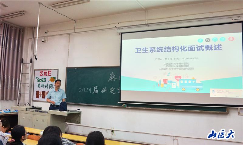 4月28日晚,麻醉学院在迎泽校区B座102教室举行2024届预毕业生就业指导会。麻醉学院井子夜副主任医师作了题为《卫生系统结构化面试概述》的讲座,麻醉学院党总支书记周立业、党总支副书记赵婧媛出席,讲座由思想政治辅导员石璟主持,2024届全体预毕业生聆听了讲座。
